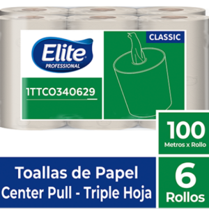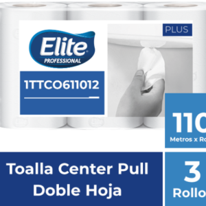 TOALLA ELITE ROLLO CENTER FLOW DOBLE HOJA EXTRA BLANCA Metros por rollo: 110 Rollos por paquete: 3 Metros por paquete: 330